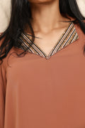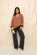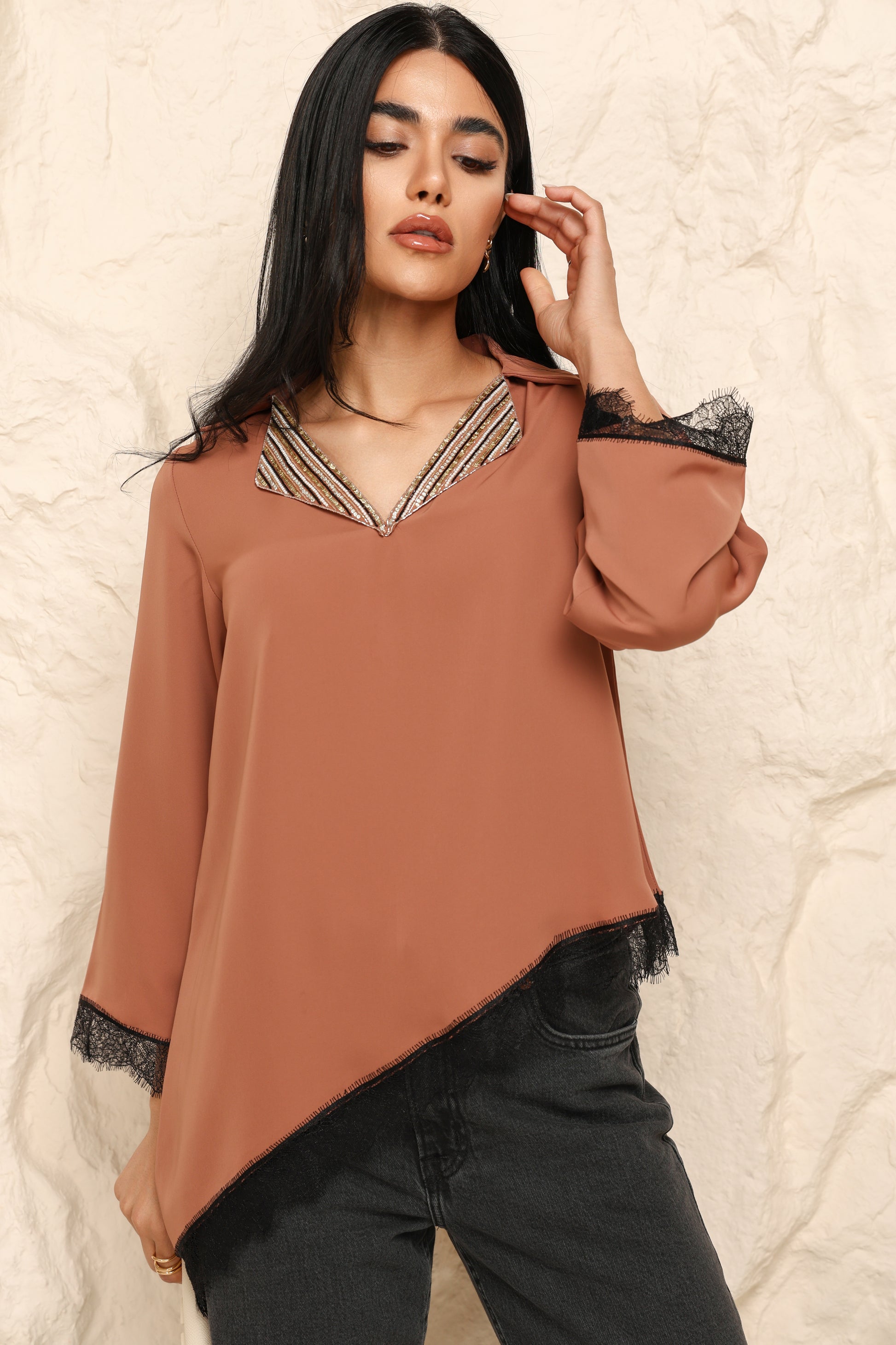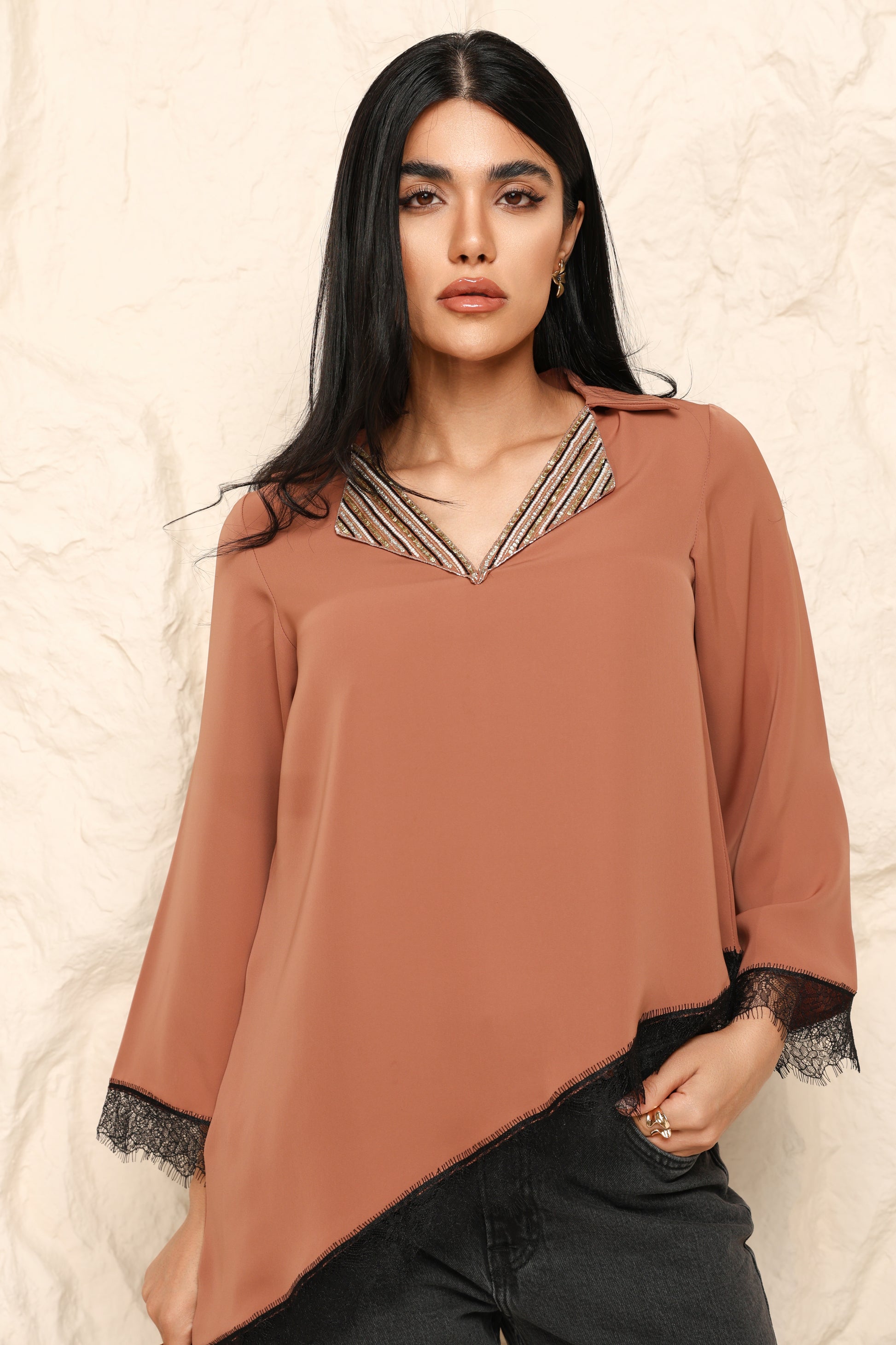 The After Hours Top is a fluid, long-sleeve silhouette with softened structure and refined detailing. A delicately embellished neckline draws the eye, while lace-trimmed cuffs and hem add quiet contrast to the clean lines.
