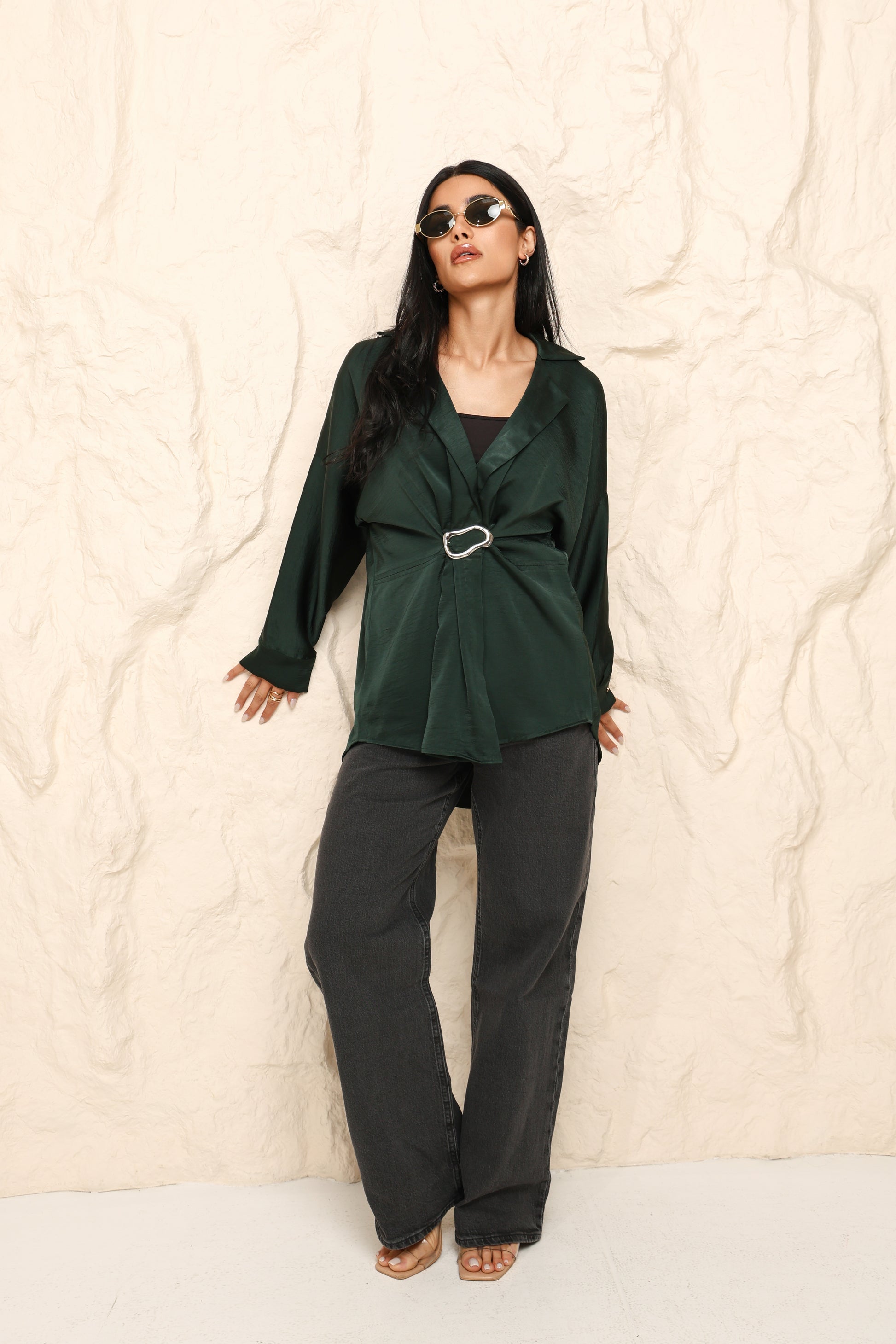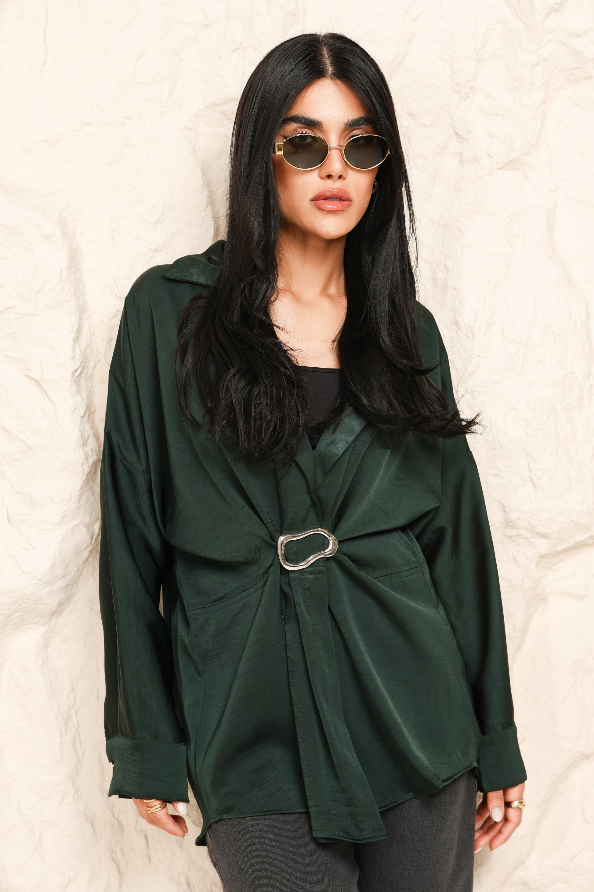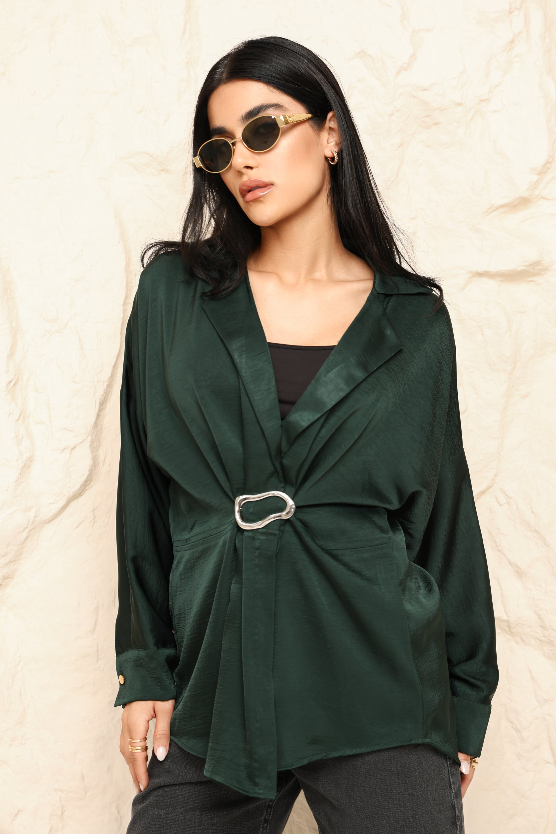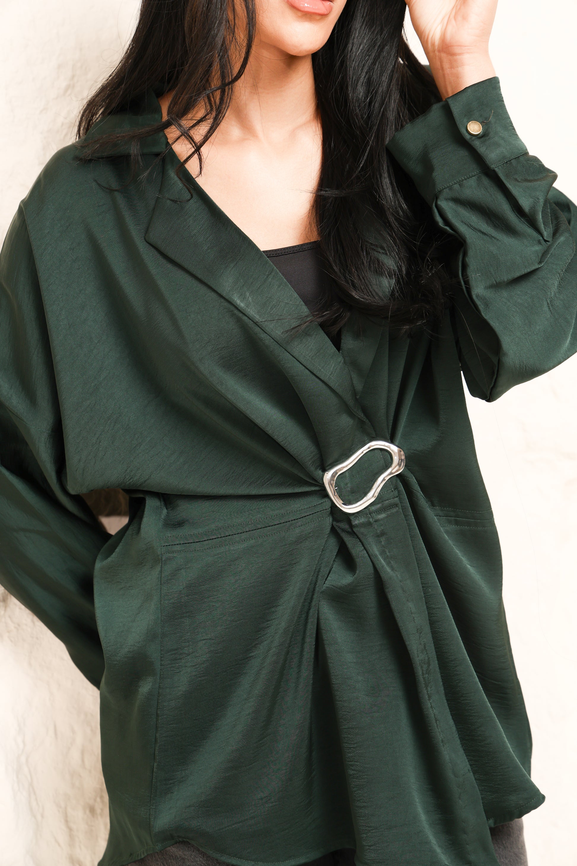 A contemporary take on classic draping, this blouse is anchored by a sculptural metal accent that draws the eye and refines the silhouette.