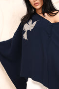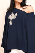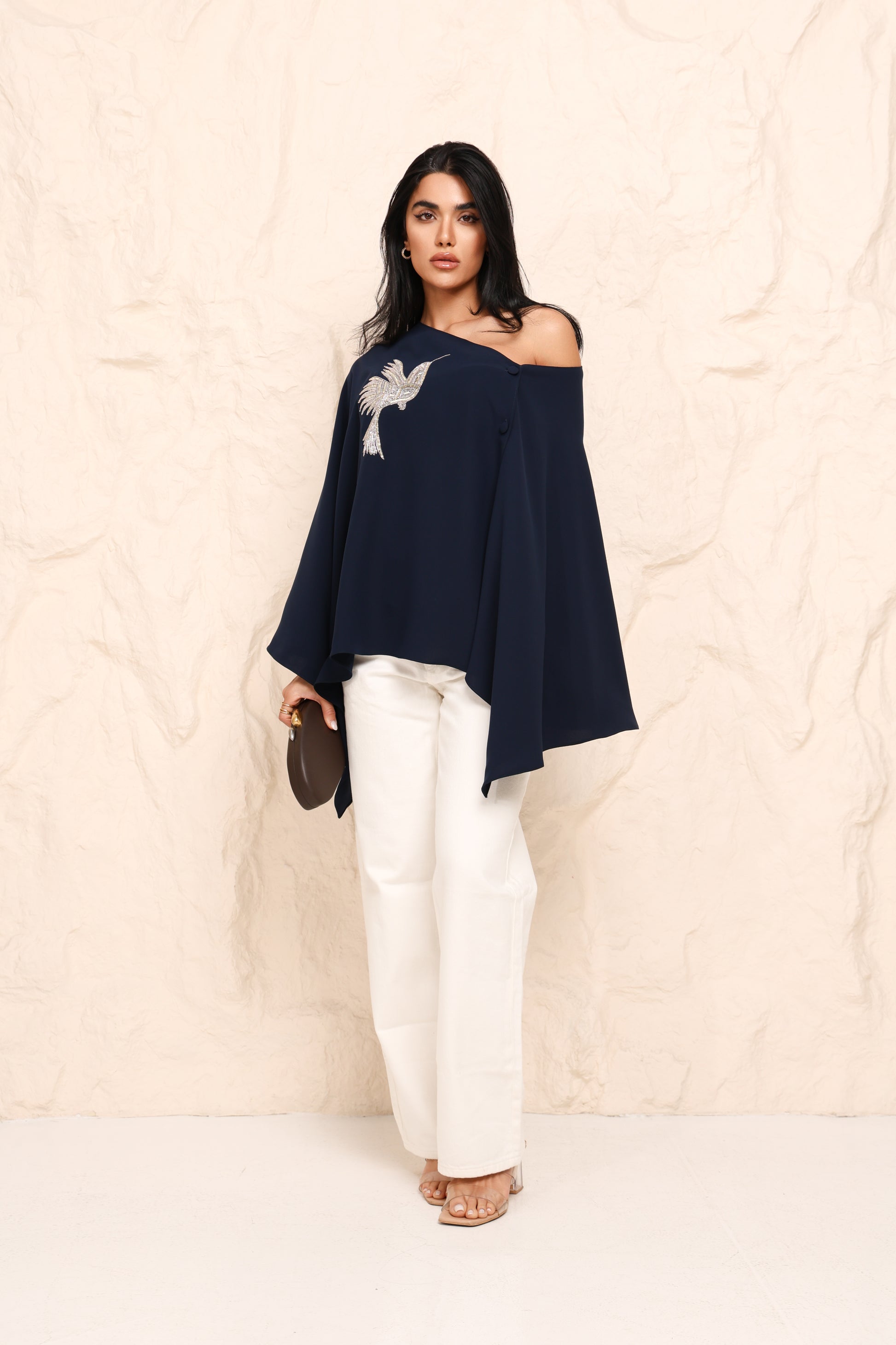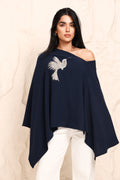 A statement cape in a fluid, asymmetric silhouette, finished with delicate embroidered detailing. Designed to drape effortlessly off the shoulder, it brings quiet drama and modern elegance to everyday dressing. Wear it off shoulder or on.