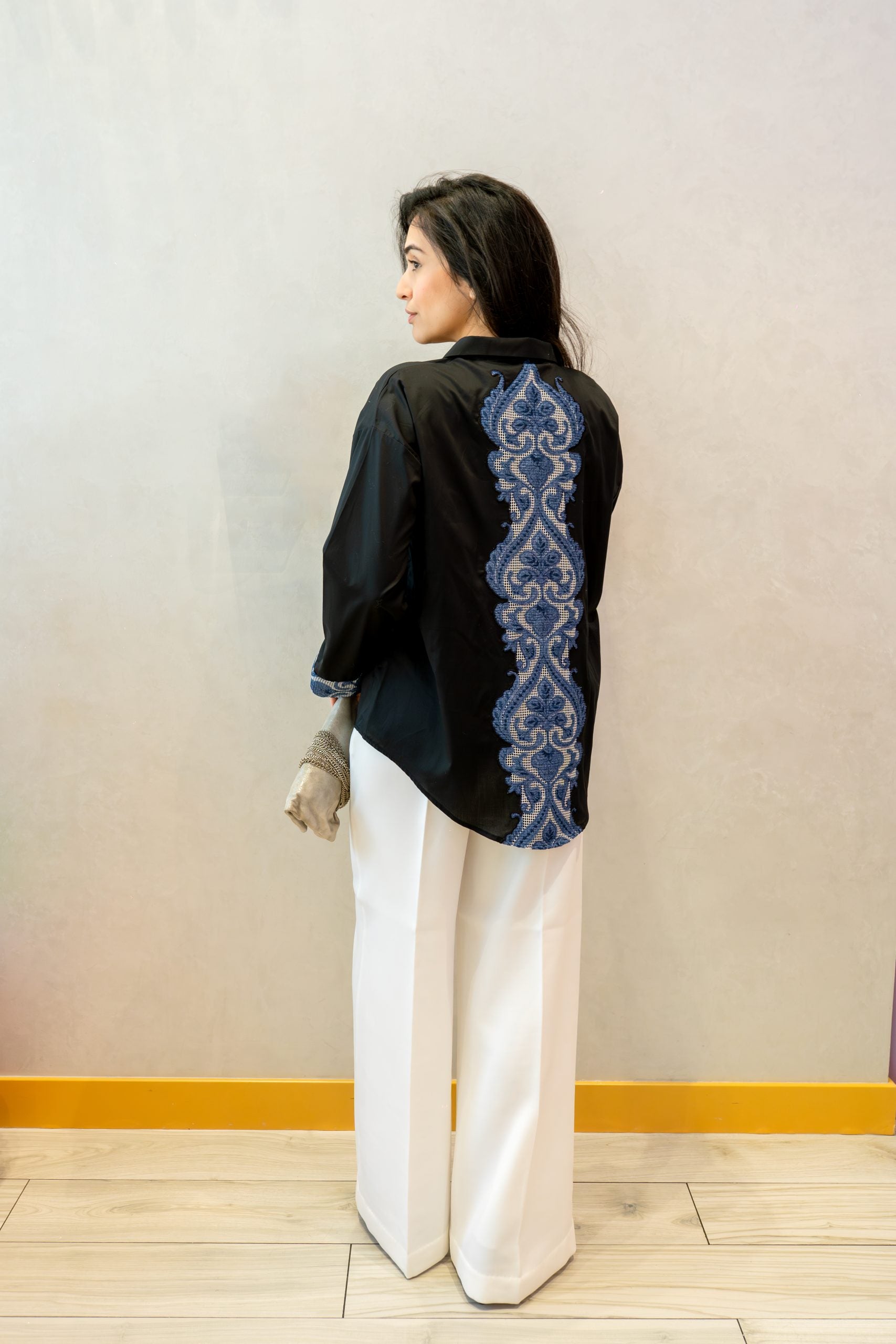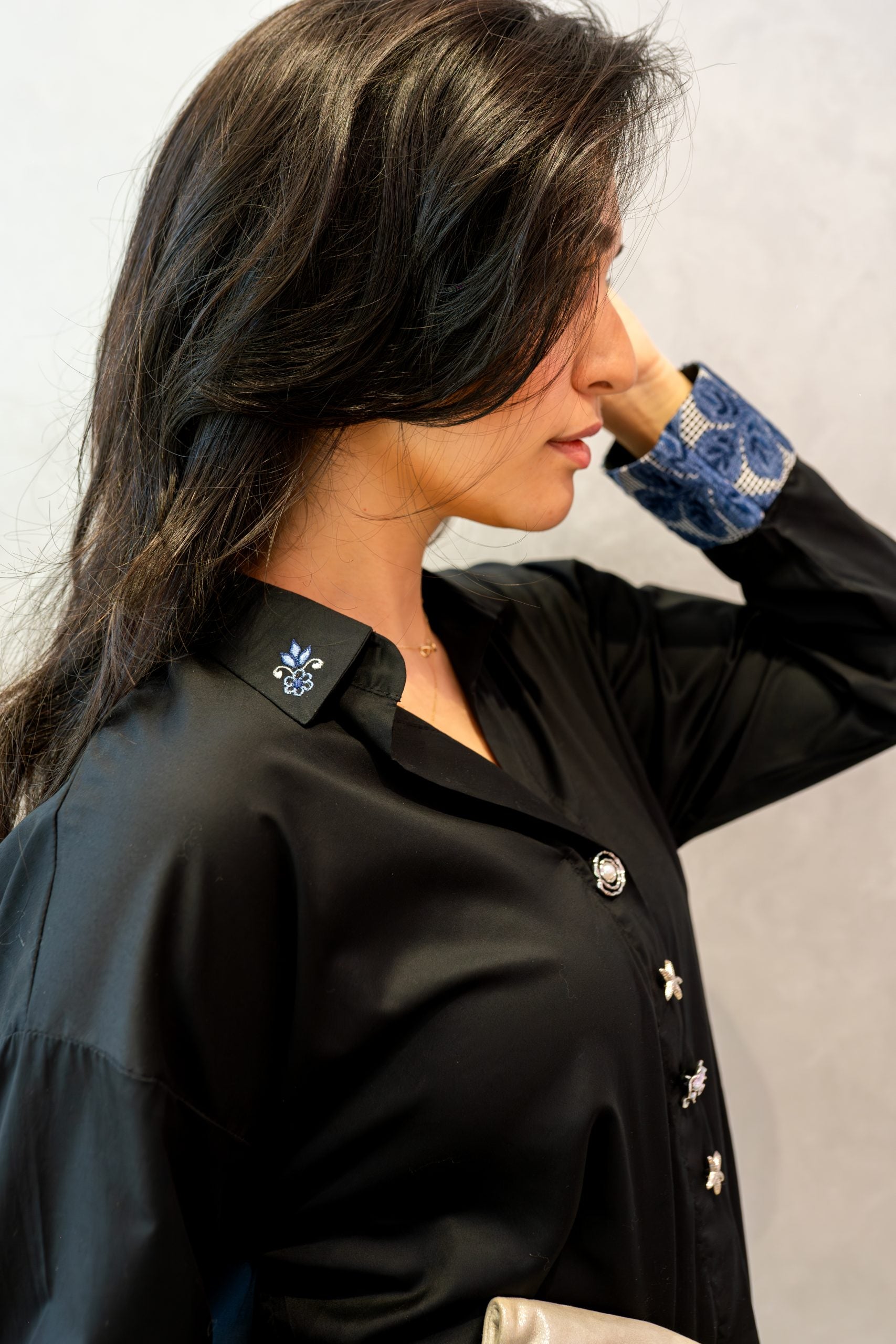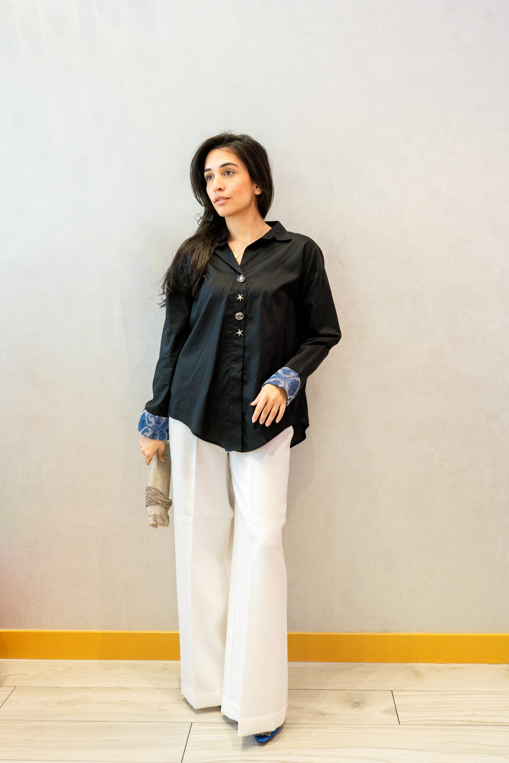 Color: White blazer with blue, green and yellow hand embroidered cuffs