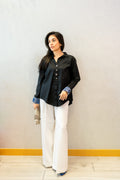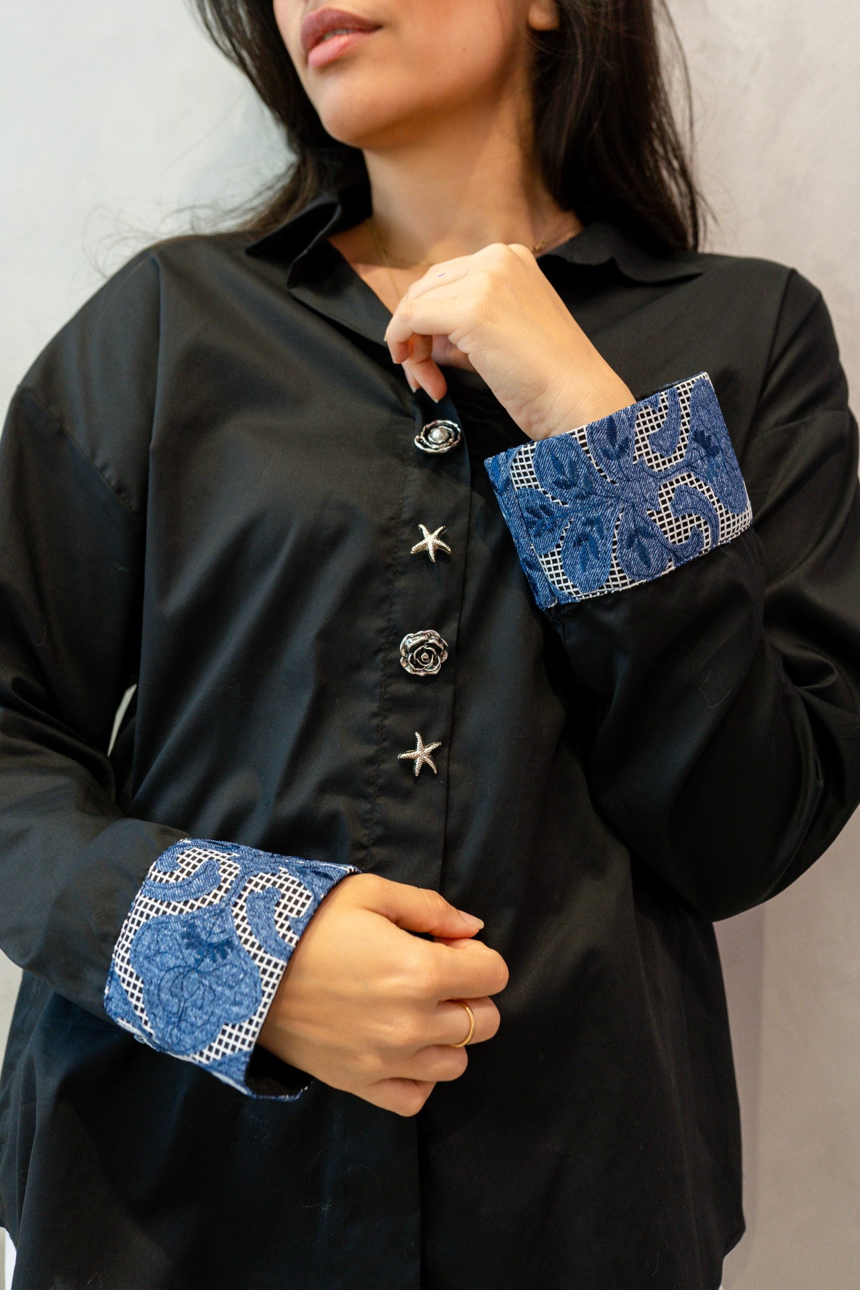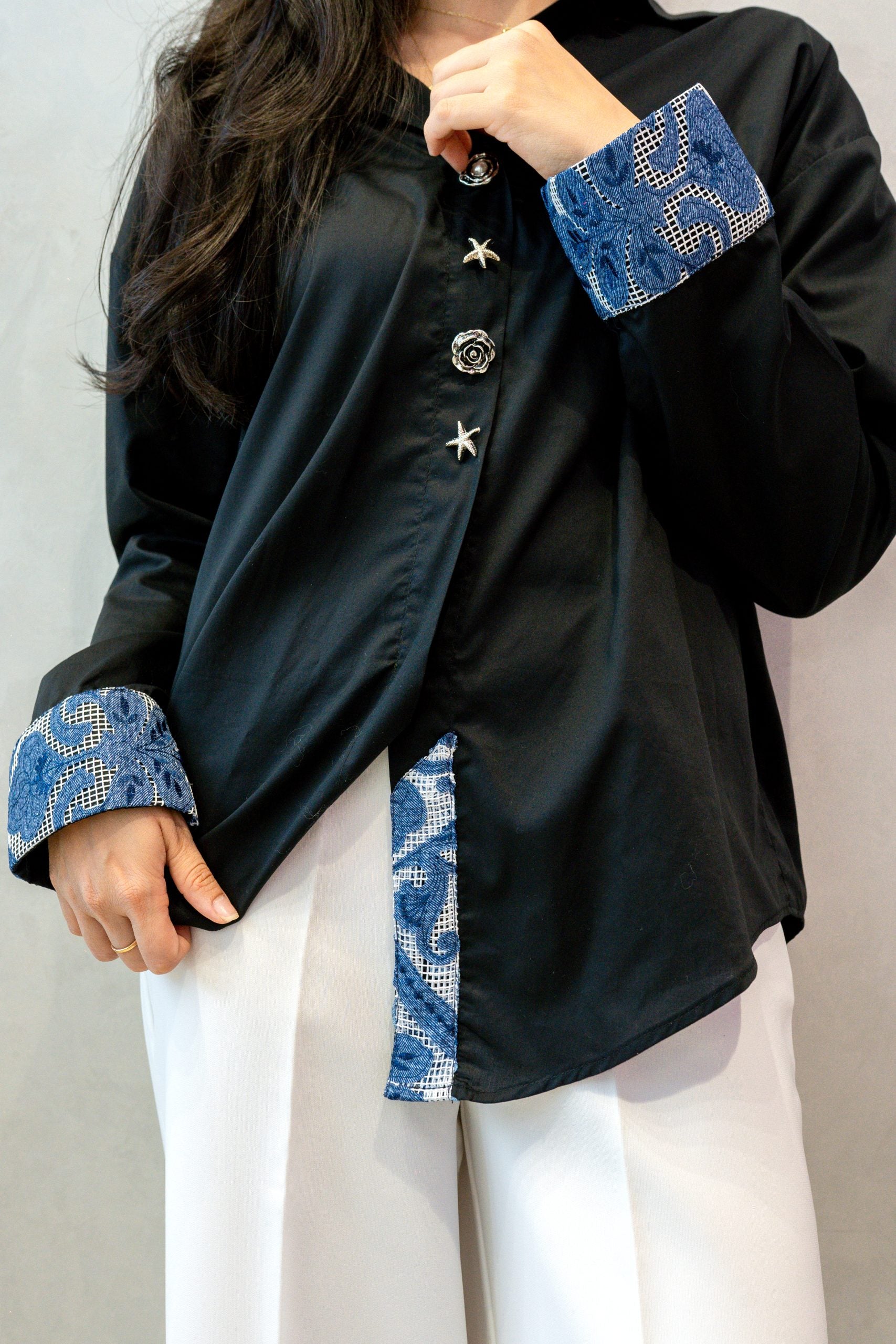 Delicate crochet lace with sky-blue cuffs brings a dreamy, artisanal touch to this breezy jacket, perfect for elevating any look with effortless charm.