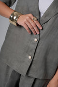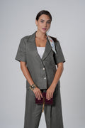 A timeless co-ord in earthy olive green, this linen blazer set features pearl-accented buttons, a structured yet relaxed cut, and wide-leg pants for a flattering silhouette. Perfect for work or weekend elegance.