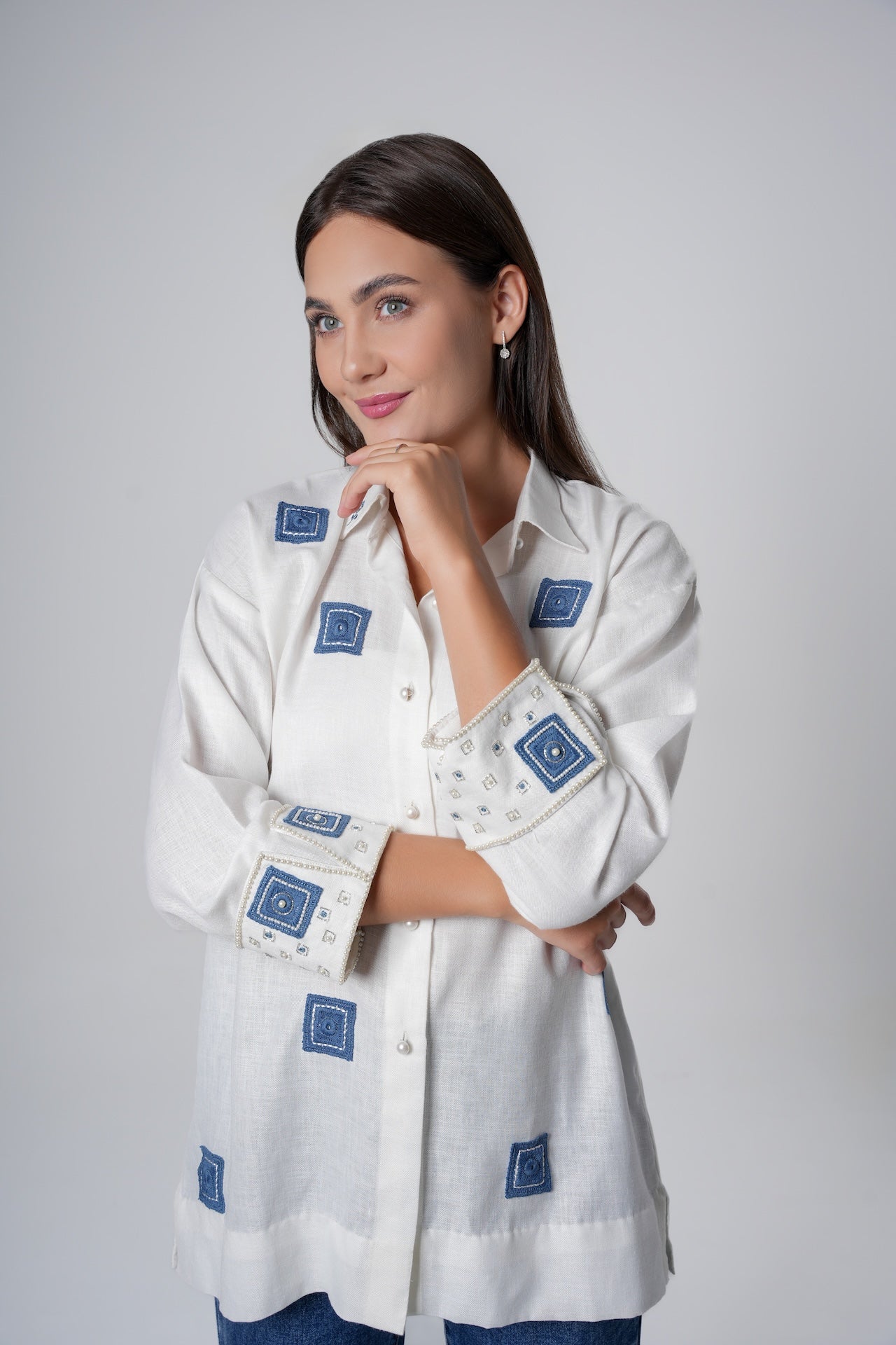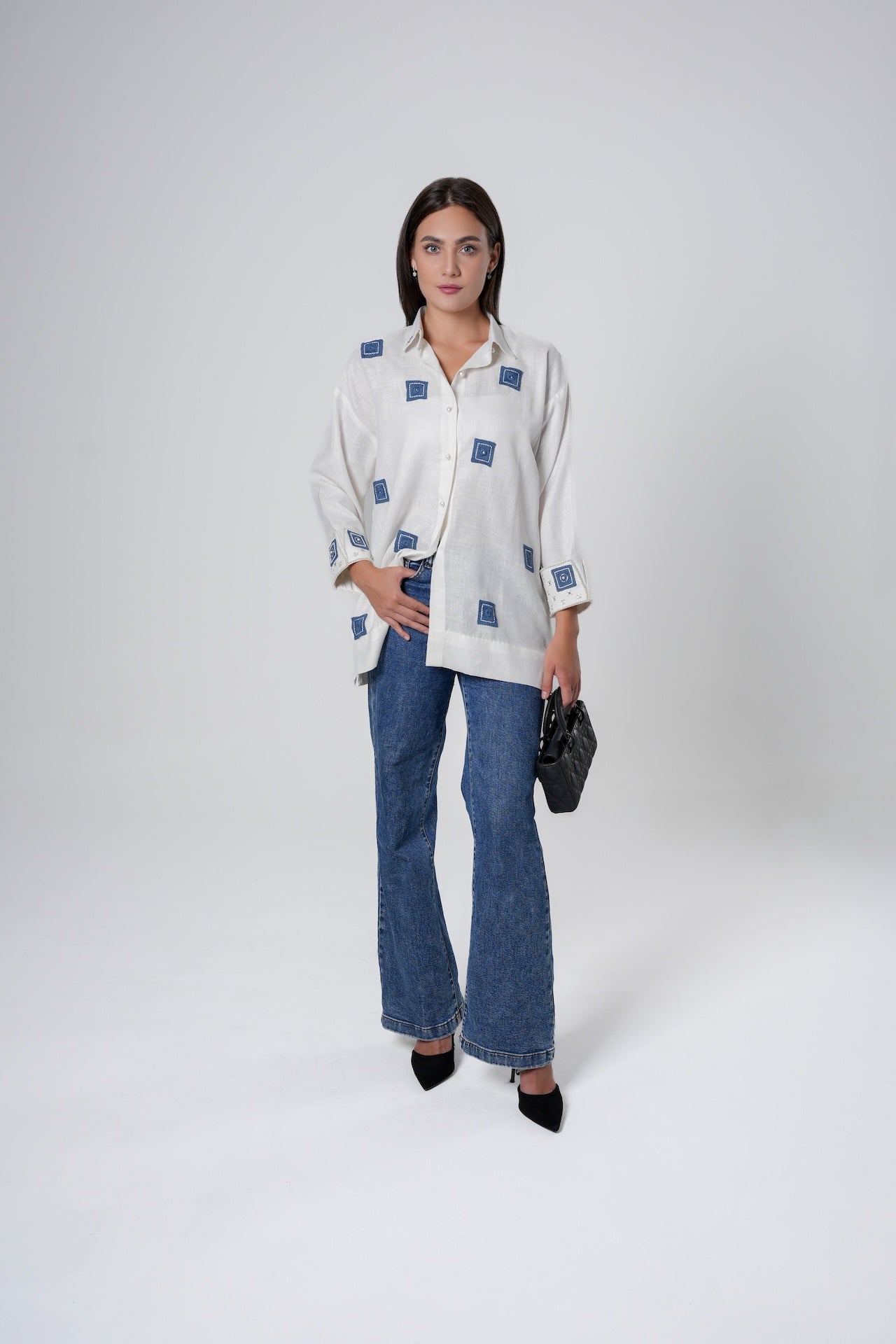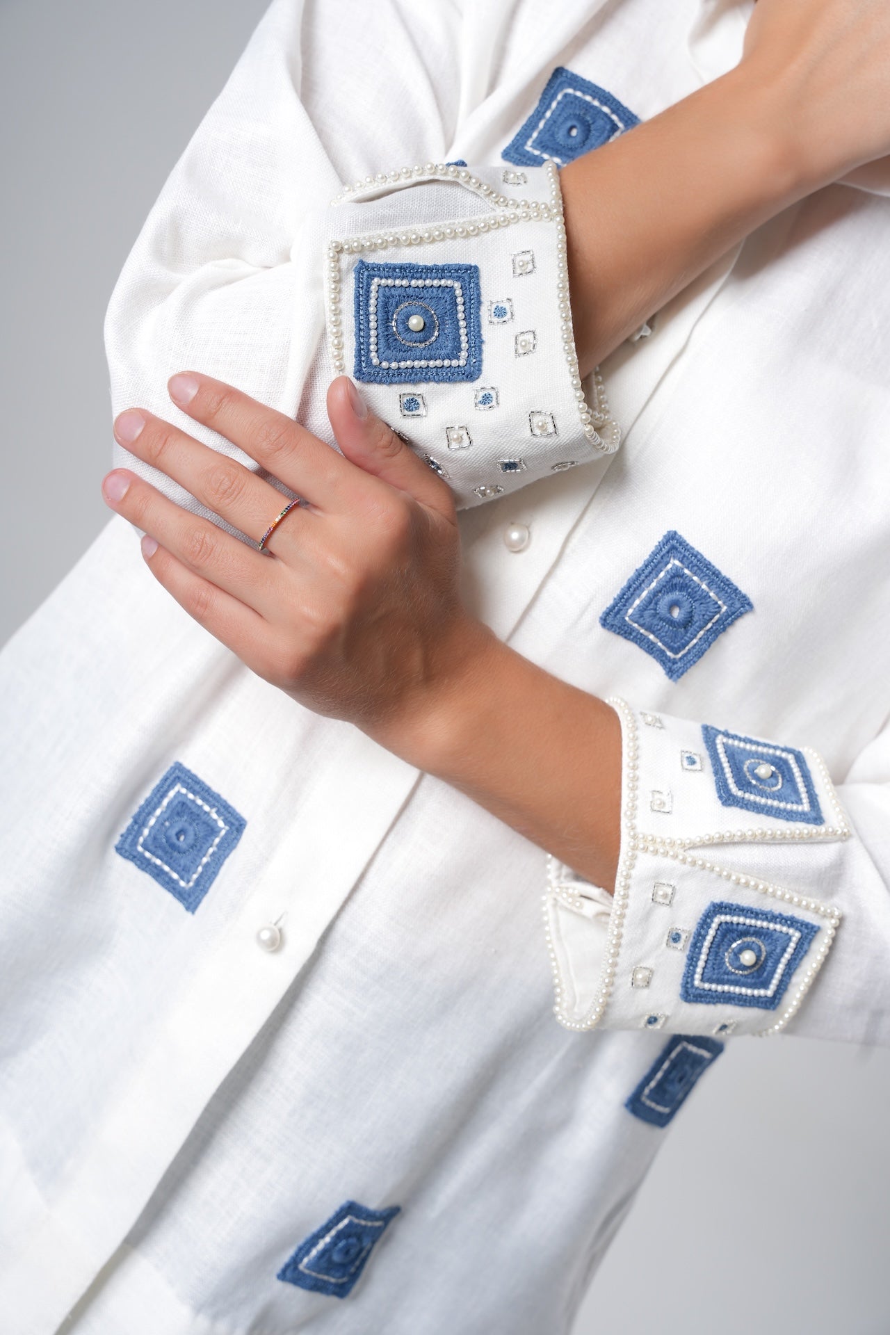 A playful twist on minimalism with denim squares and pearl-tipped charm.