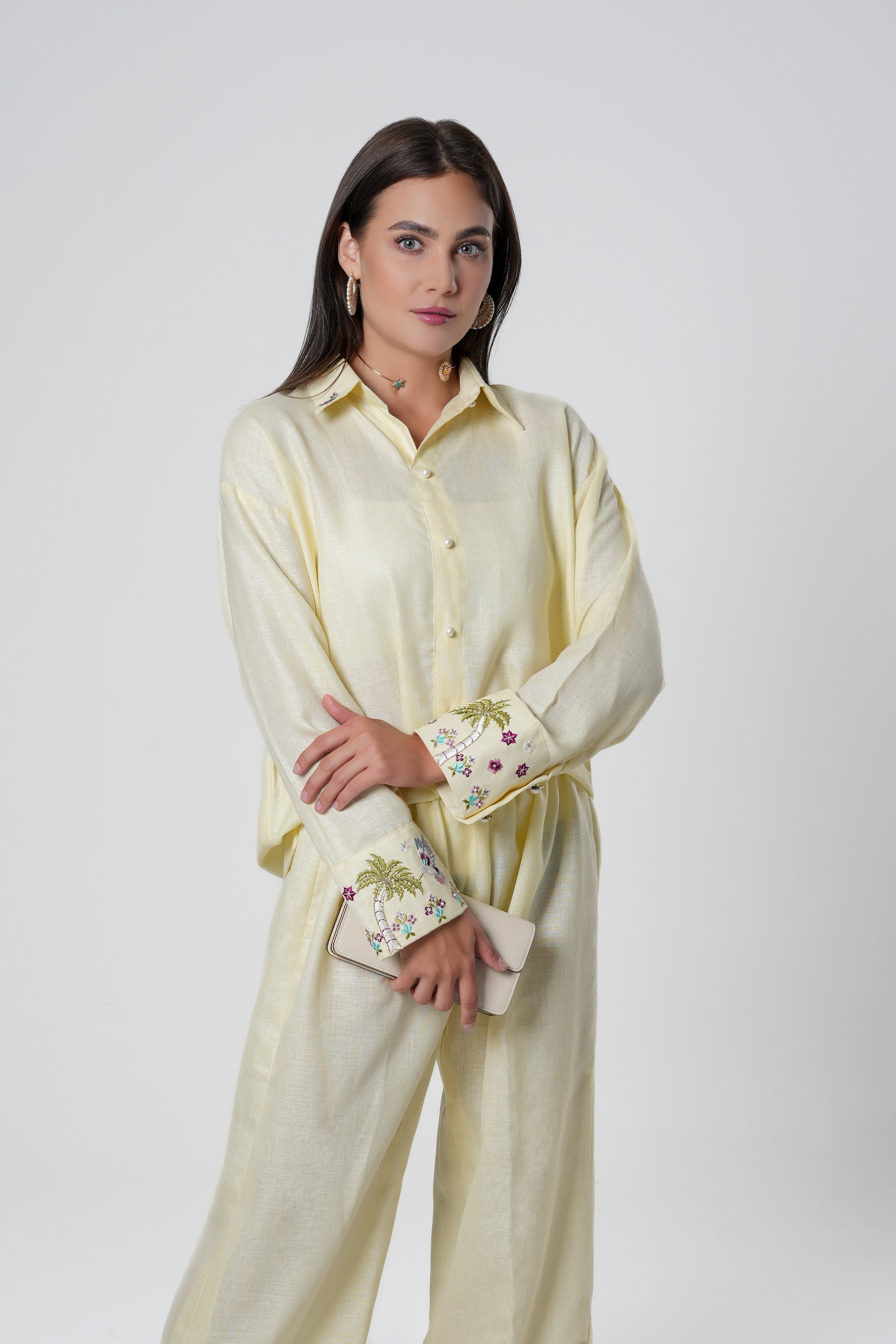 The delicate embroidery adds a whisper of whimsy to this light-as-air set. Includes a linen shirt with matching pants that are double lined.