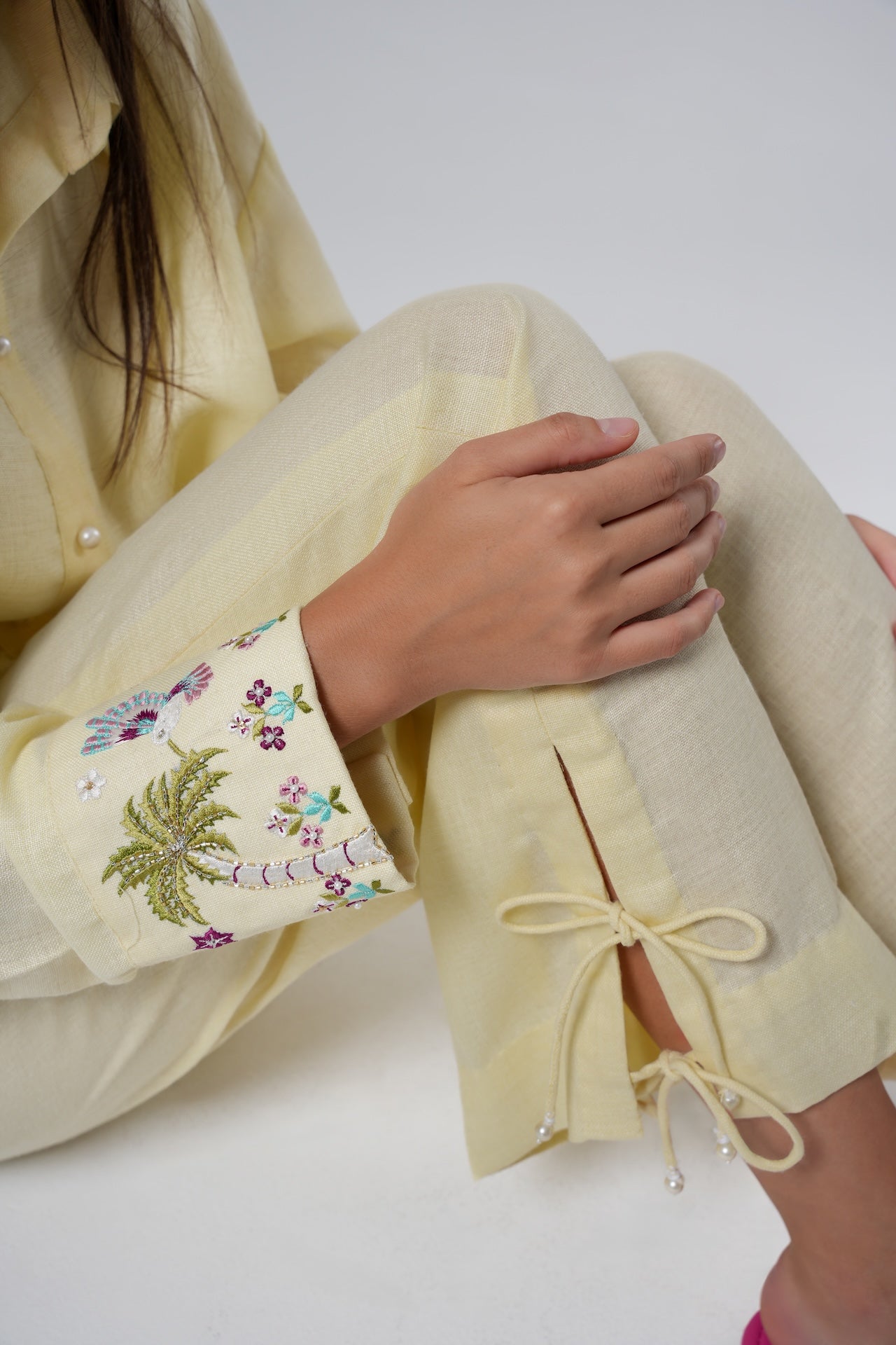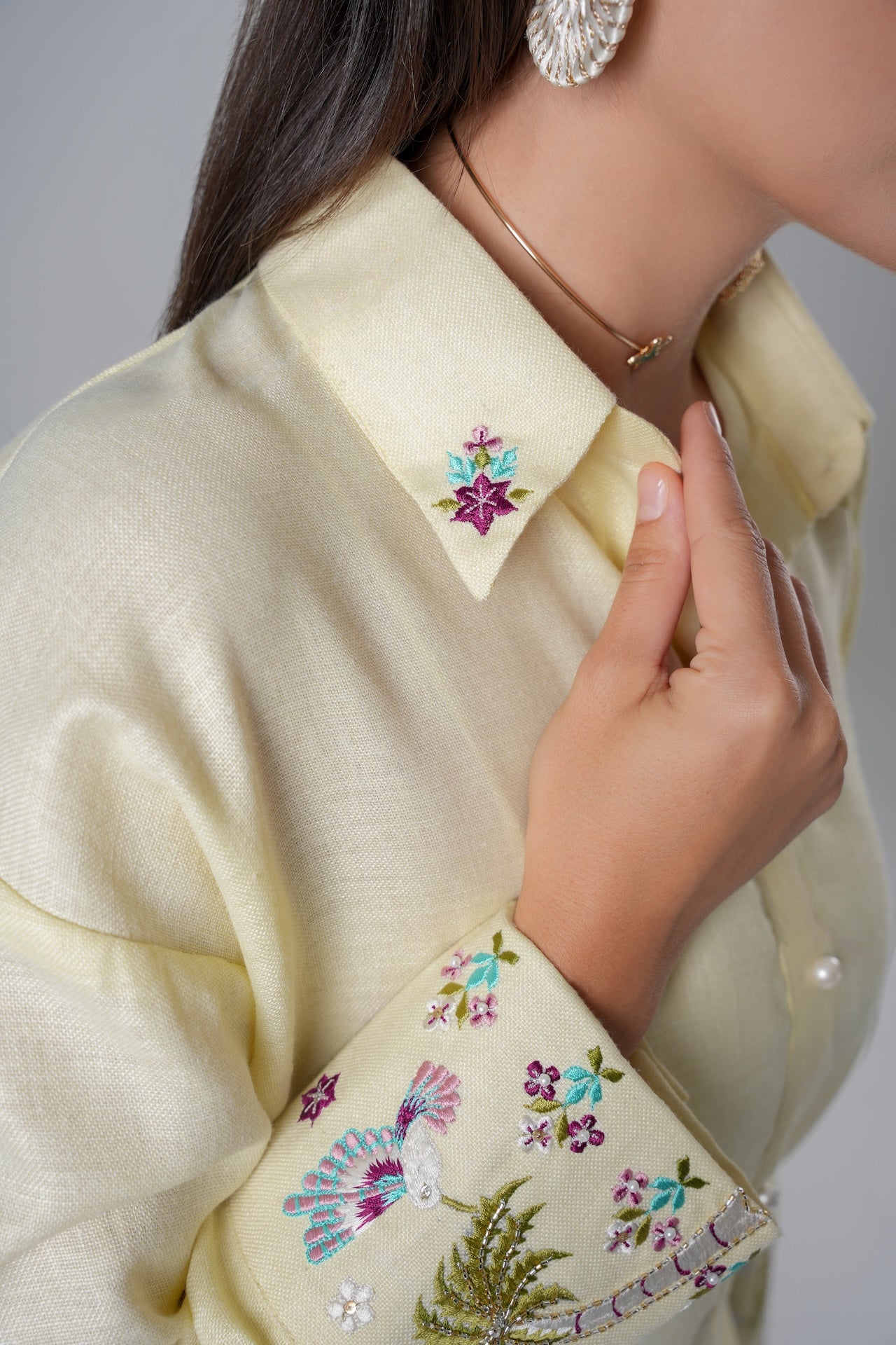 Color: Lemon yellow with elements of fuchsia hand embroidery