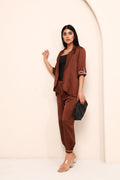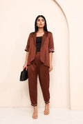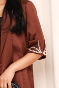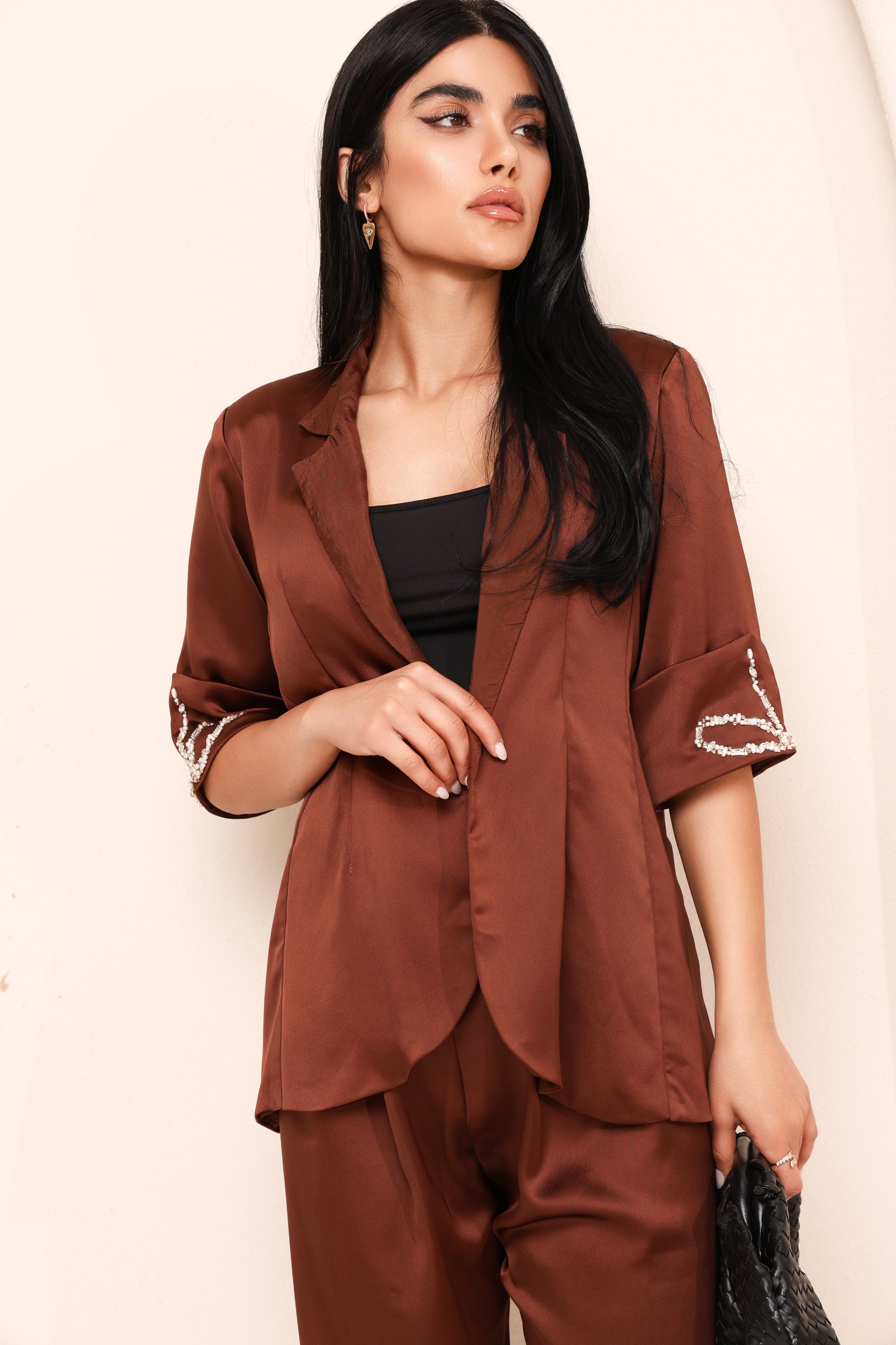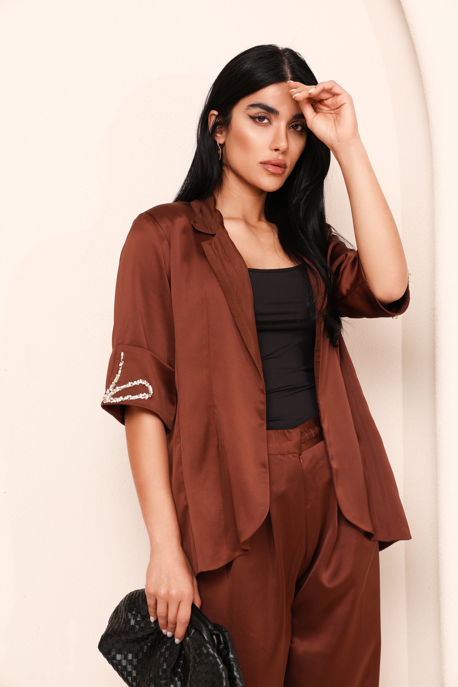 A fluid, open-front jacket crafted in a rich copper-brown hue, designed with relaxed tailoring and subtle sleeve embellishment. The soft drape creates effortless movement, while delicate beaded detailing at the cuffs adds a quiet point of interest.