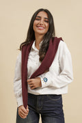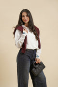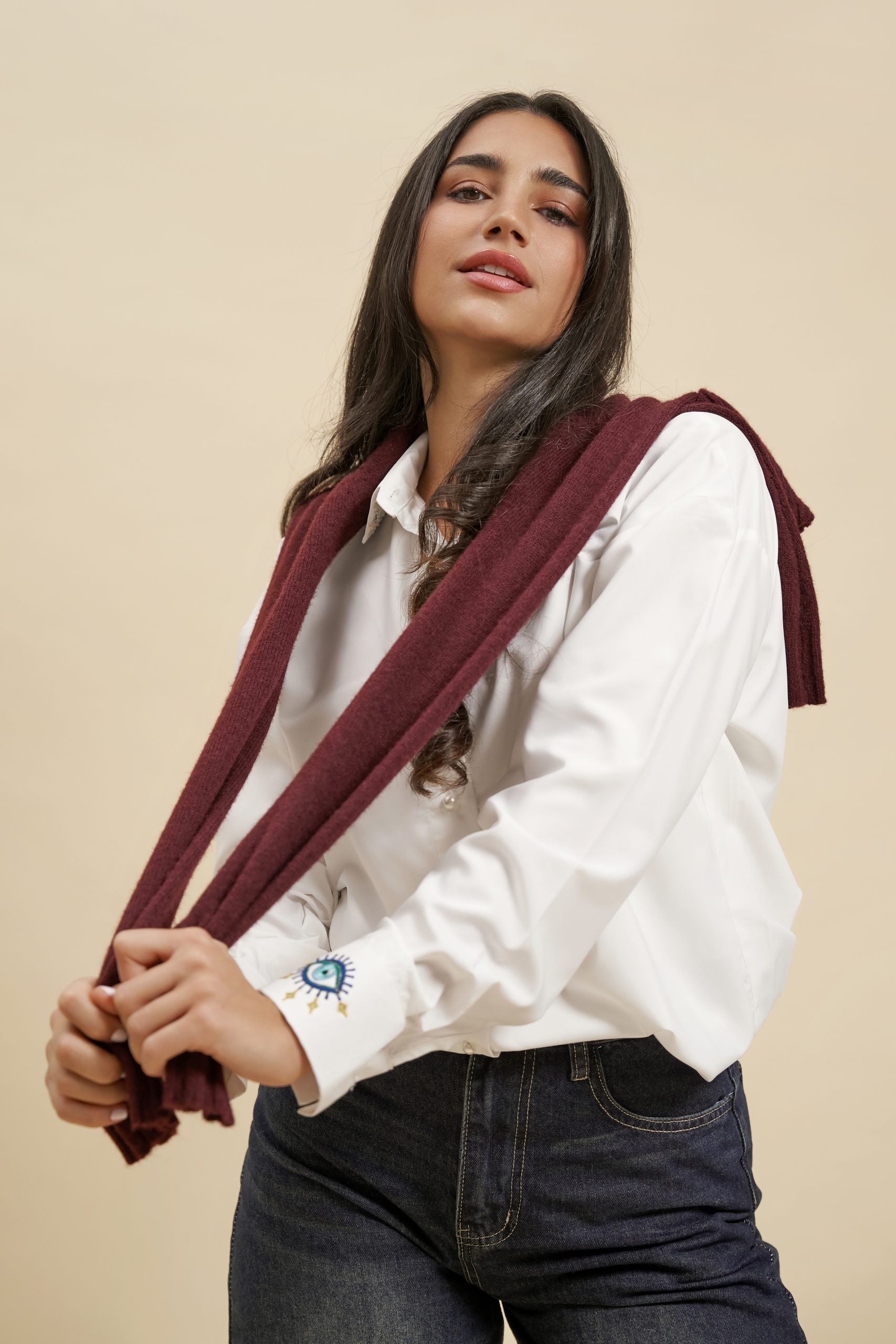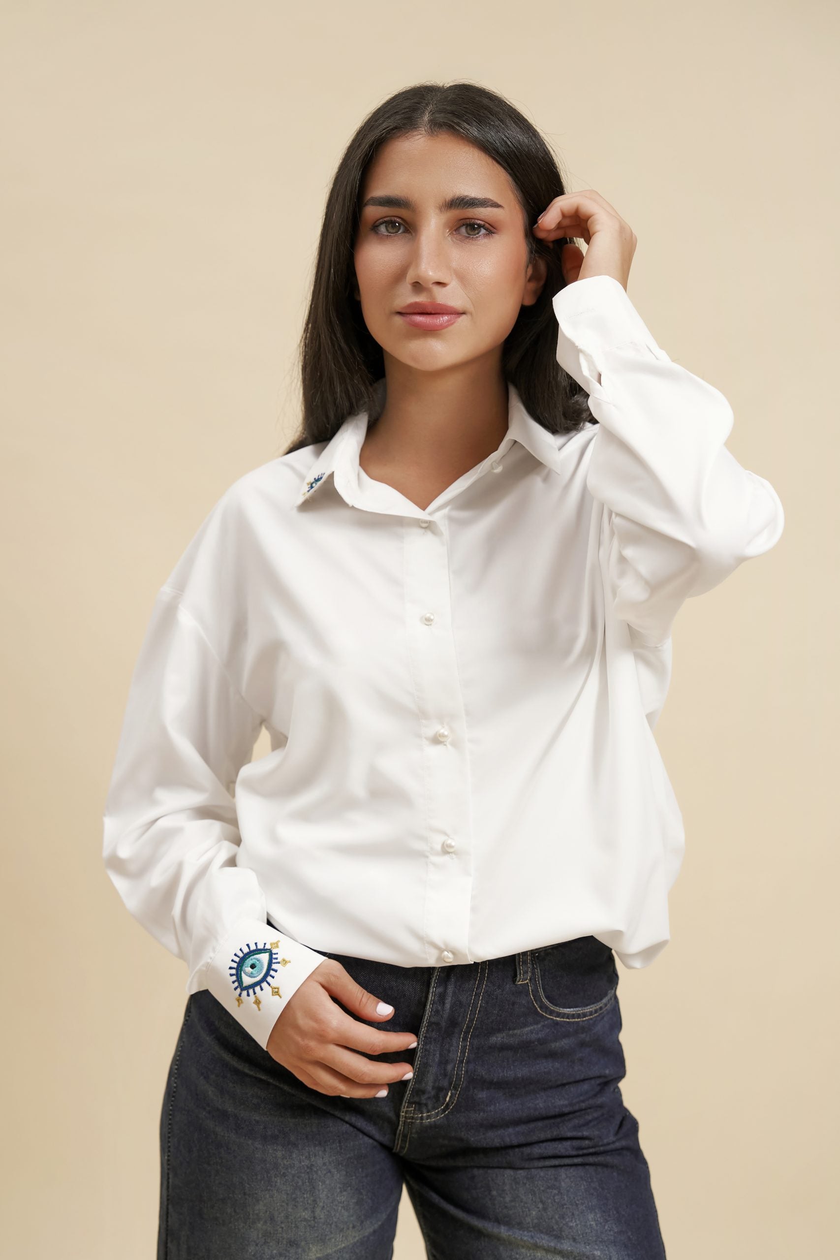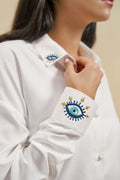 Evil Eye embroidery with dark turquoise thread work and gold details to add a dash of mystique to your look.